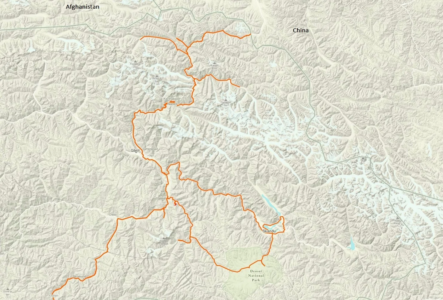 Route in Nord-Pakistan, Stand 25.09.22. Quelle: Gaia GPS / Open Street Map.