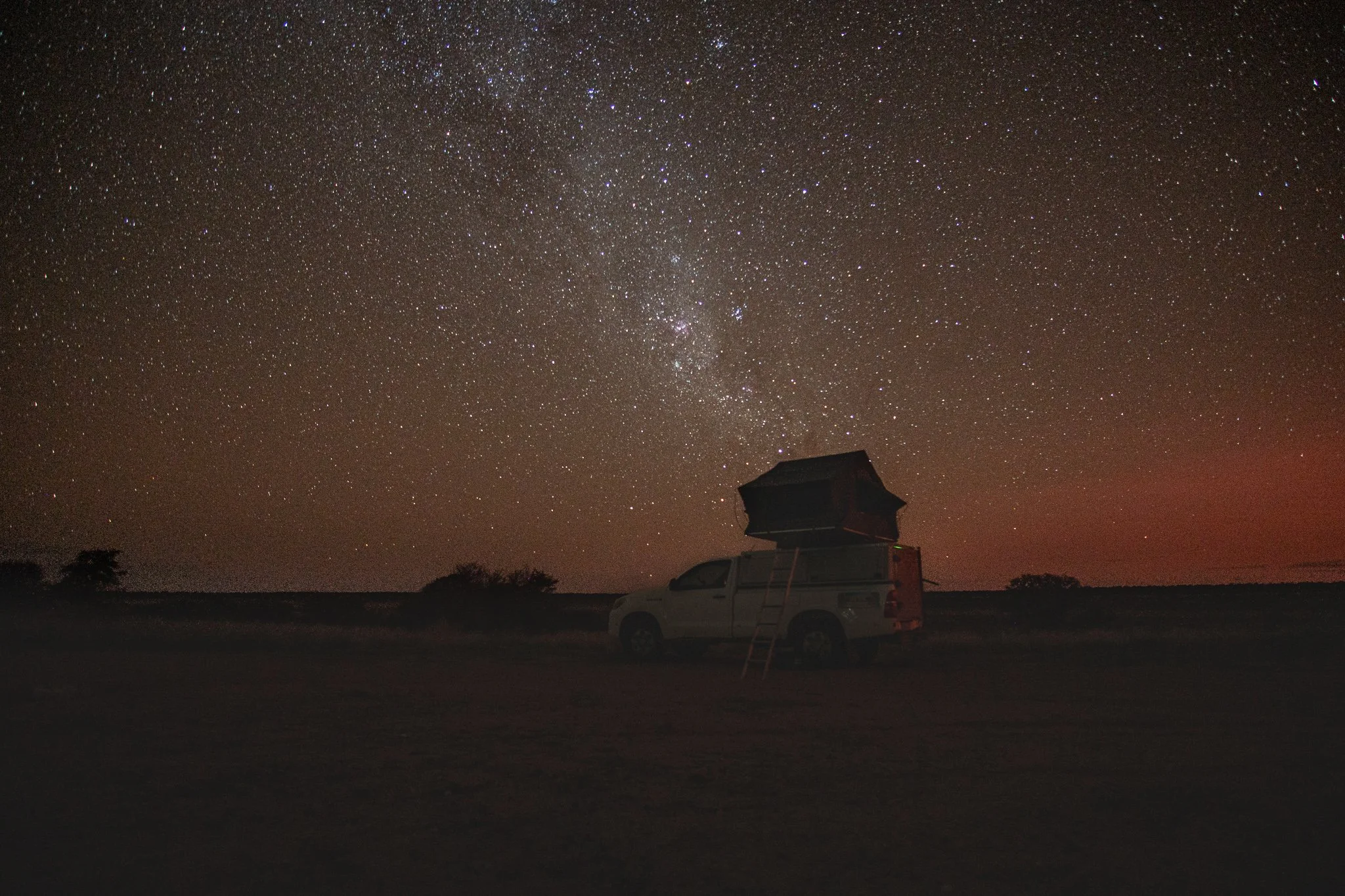Wir diskutierten unsere Möglichkeiten. An der Stelle stehenzubleiben, war keine Option, denn das heranziehende Unwetter wäre für uns zwei Autos mit Dachzelt auf einer flachen Ebene ohne jegliche Erhöhungen zu gefährlich. Kurzerhand entschieden wir uns, alle bei uns im Auto zu schlafen und räumten alle wichtigen Utensilien von einem ins andere Auto. Linda und die zwei Jungs setzten sich auf den Beifahrersitz, Caro und Enrique stiegen aufs Autodach und Julian gab sein bestes, alle heil zum Platz zu bringen. Wir waren beeindruckt von der Gelassenheit der vier, die sich nicht aus der Ruhe haben bringen lassen. Die beiden Jungs sind wohl die unkompliziertesten Kinder, die wie je gesehen haben. Laut Linda hat es ein paar Wochen gedauert, bis sie verstanden haben, was „Mama und Papa mit ihnen vorhaben“, danach haben sie sich aber ohne Probleme auf jedes Abenteuer eingelassen. Am Platz angekommen, räumten wir die gesamte Ladefläche des Autos aus und stellten alle Taschen und Kisten geschlossen unter das Holzabdach. Die Matratze aus dem Dachzelt der Familie passte ungefähr auf die Ladefläche und so war die Notlösung für die Nacht gefunden: sechs Personen auf nichtmal sechs Quadratmetern. Kurz vorm Schlafengehen kreuzte ein Leopard unser Camp, den Caro und Enrique wohl mit Taschenlampe und Rufen nach Julian, der gerade wenige Meter entfernt duschen war, verscheuchte.