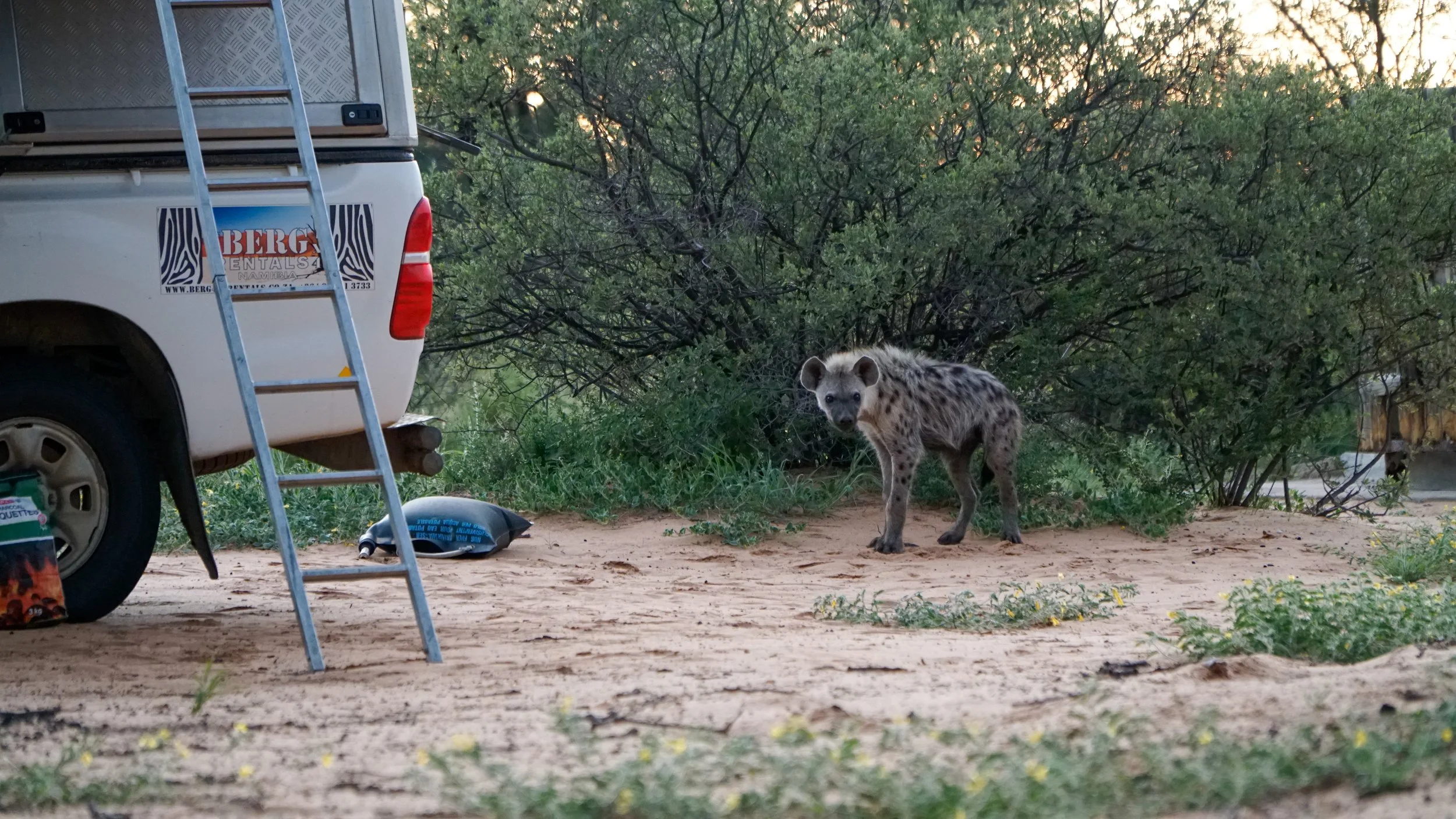 Schon seit sechs Monaten reist die Familie durch Afrika und befindet sich derzeit auf dem Rückweg nach Holland. Die letzten Tage in Botswana wollten wir dann nochmal gemeinsam verbringen und uns über unsere Erlebnisse austauschen. An unserem wunderschön gelegenen Campingplatz bereiteten wir ein gemeinsames Abendessen vor und unterhielten uns. Anders als in Südafrika sind in Botswana teilweise zwar die Außengrenzen solcher Naturreservate zum Schutz der Anwohner und deren Farmen eingezäunt, an den Übernachtungsplätzen innerhalb des Parks gibt es jedoch keinerlei Barrieren. Jeder Platz ist ausgestattet mit einer Holzüberdachung, einer Grillmöglichkeit sowie einer Toilette und Dusche im Freien. Das Wasser dafür muss mitgebracht werden. Und so waren wir dann auch nicht verwundert, als uns eine Hyänenmutter mit ihren zwei Jungen besuchte, als die Dämmerung langsam hineinbrach. Die Jungtiere kundschafteten neugierig unser Auto aus, während die Mutter uns sechs die ganze Zeit im Blick behielt. Die Jungs wurden vorsichtshalber ins Auto geschickt - schließlich hat man es noch immer mit wilden Tieren zu tun.