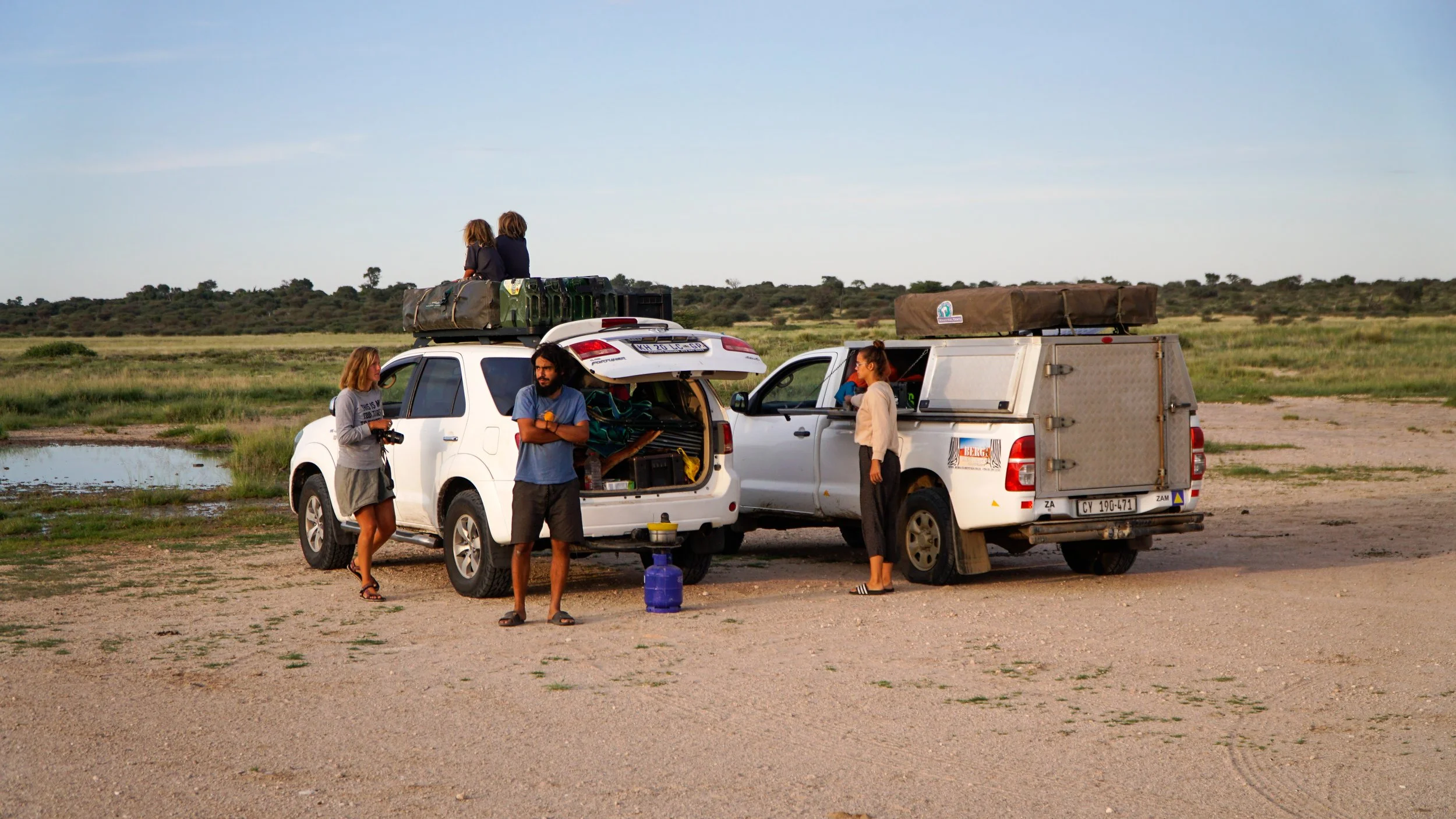 So gingen auch wir vor und verbrachten den Tag mit einer Mischung aus Spuren verfolgen und Zeit am Camp verbringen. Anders als in Südafrika kann man in Botswanas wilden und sandigen Reservaten bestens nach Spuren von Tieren Ausschau halten. Je nach „Frische“ kann man ihre Laufwege genau beobachten und ihnen folgen. Zum Sonnenuntergang nahmen wir eine letzte Rundfahrt zur nächstgelegenen Pfanne vor. Als wir gerade wieder zu unserem Schlafplatz fahren wollten, merkte wir, dass sich das Auto der anderen nicht bewegte. Linda öffnete die Tür und sagte „ich kann den Schlüssel nicht mehr drehen!“. Das Problem kündigte sich in den vergangenen Tagen bereits an, jedoch war es dann immer mit etwas Gefühl und Geduld zu lösen. Jeder von uns versuchte nochmal sein Glück, aber nichts schien sich zu bewegen. Der Schlüssel im Zündschloss wollte einfach nicht greifen. Allmählich kündigte sich über uns ein Unwetter an und die Sonne war so gut wie untergegangen. Und auch die Tiere um uns herum mehrten sich. Nicht der beste Platz, um liegenzubleiben.