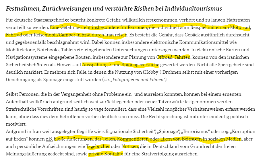 Wir sind eigentlich keine großen Fans der Reise- und Sicherheitshinweise des Auswärtigen Amtes. Denn wenn es nach ihnen ginge, dürfte man rein theoretisch aus Sicherheitsgründen nicht mal in die Türkei, einem der Hauptreiseziele der Deutschen, reisen. Aber so konkret, wie der Beitrag für den Iran derzeit ist, kann es deutlicher kaum noch werden. Und mit den meisten Anhaltspunkten der Reisewarnung deckt sich unsere Art des Reisens. Mittlerweile steht die Aufforderung zur Ausreise aus dem Iran auf derselben Stufe wie die von Afghanistan.
