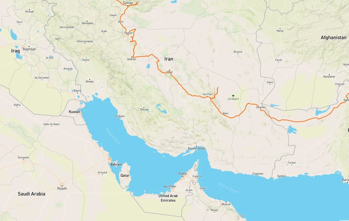 Route in Iran, Stand 13.08.22. Quelle: Gaia GPS / MapBox / Open Street Map.