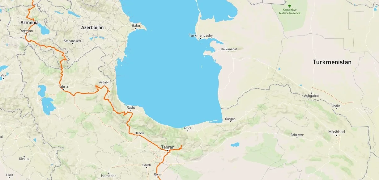 Route in Iran, Stand 30.07.22. Quelle: Gaia GPS / MapBox / Open Street Map.