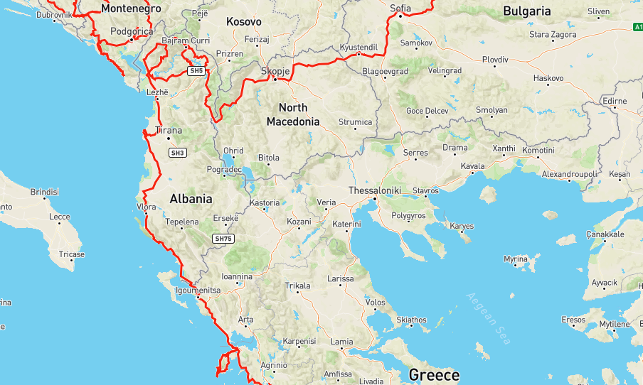 Route in Bulgarien, Nordmazedonien und Albanien, Stand 16.10.2021. Quelle: Gaia GPS / MapBox / Open Street Map.
